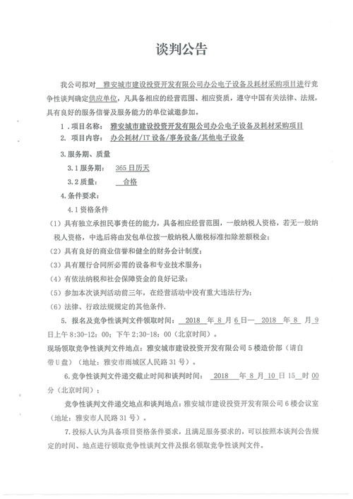 雅安城市建設(shè)投資開發(fā)有限公司辦公電子設(shè)備及耗材采購項(xiàng)目——競爭性談判公告