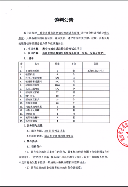 雅安市城市道路抑塵治理試點項目進行競爭性談判公告(市政公司)