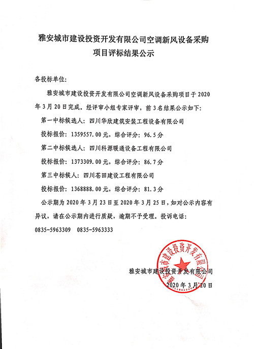 城投公司空調新風設備采購項目評標結果公示