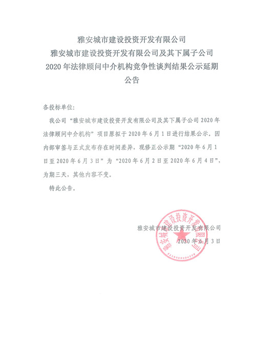 雅安城市建設(shè)投資開發(fā)有限公司及其下屬子公司2020年法律顧問中介機構(gòu)競爭性談判結(jié)果公示延期公告