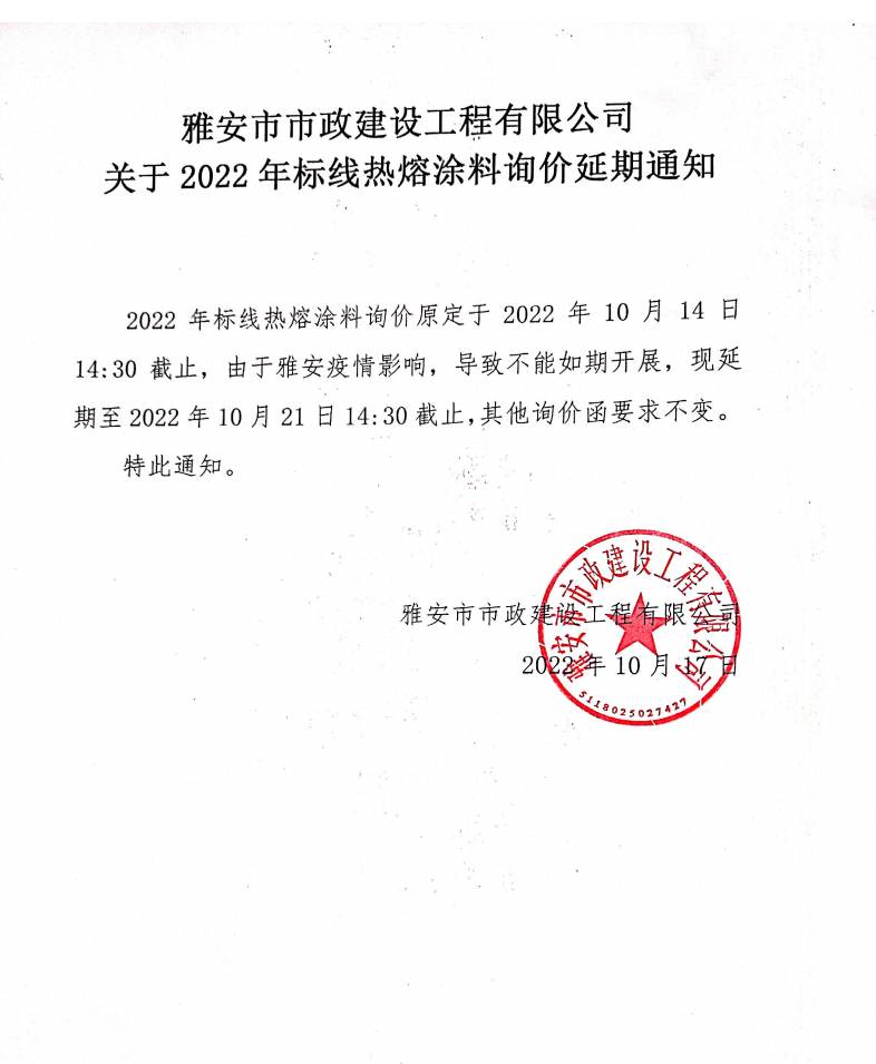 雅安市市政建設工程有限公司關于2022年標線熱熔涂料詢價延期通知