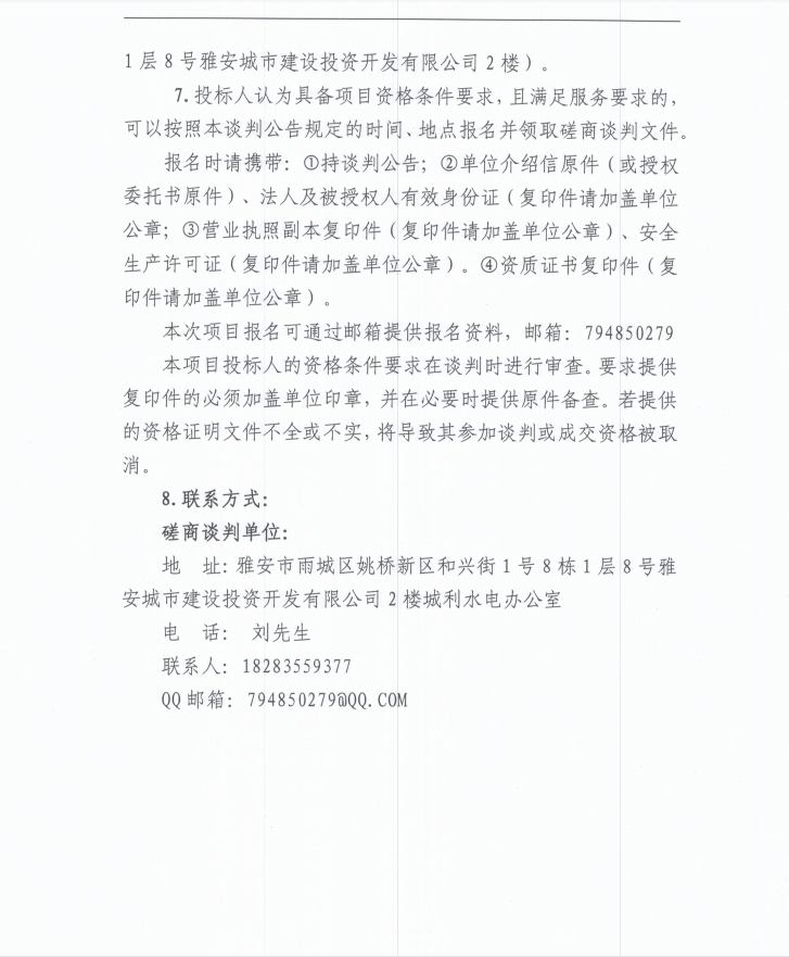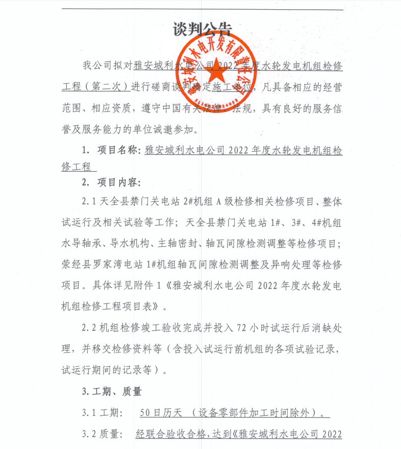 雅安城利水電公司2022年度水輪發(fā)電機(jī)組檢修工程(第二次)磋商談判公告