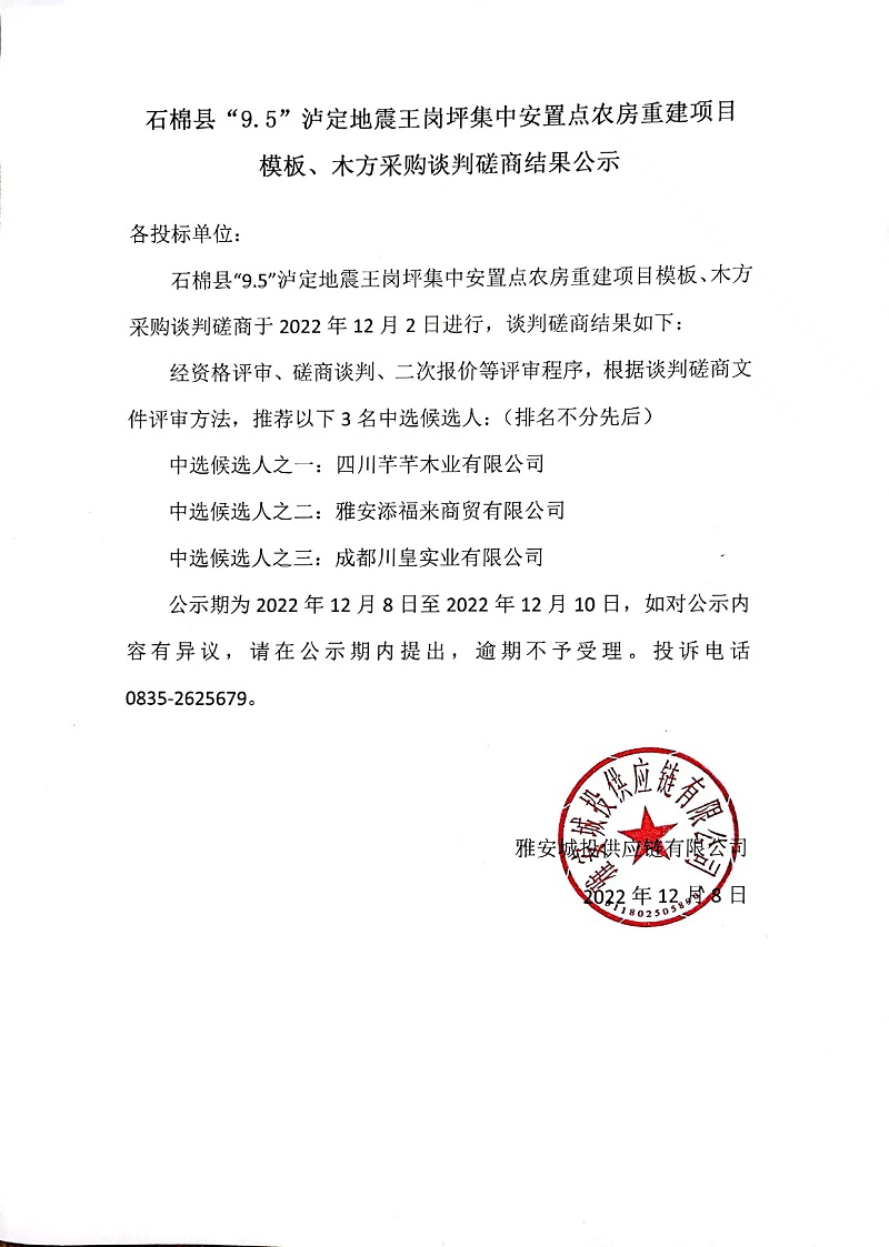 石棉縣“9.5”瀘定地震王崗坪集中安置點(diǎn)農(nóng)房重建項(xiàng)目模板、木方采購談判磋商結(jié)果公示