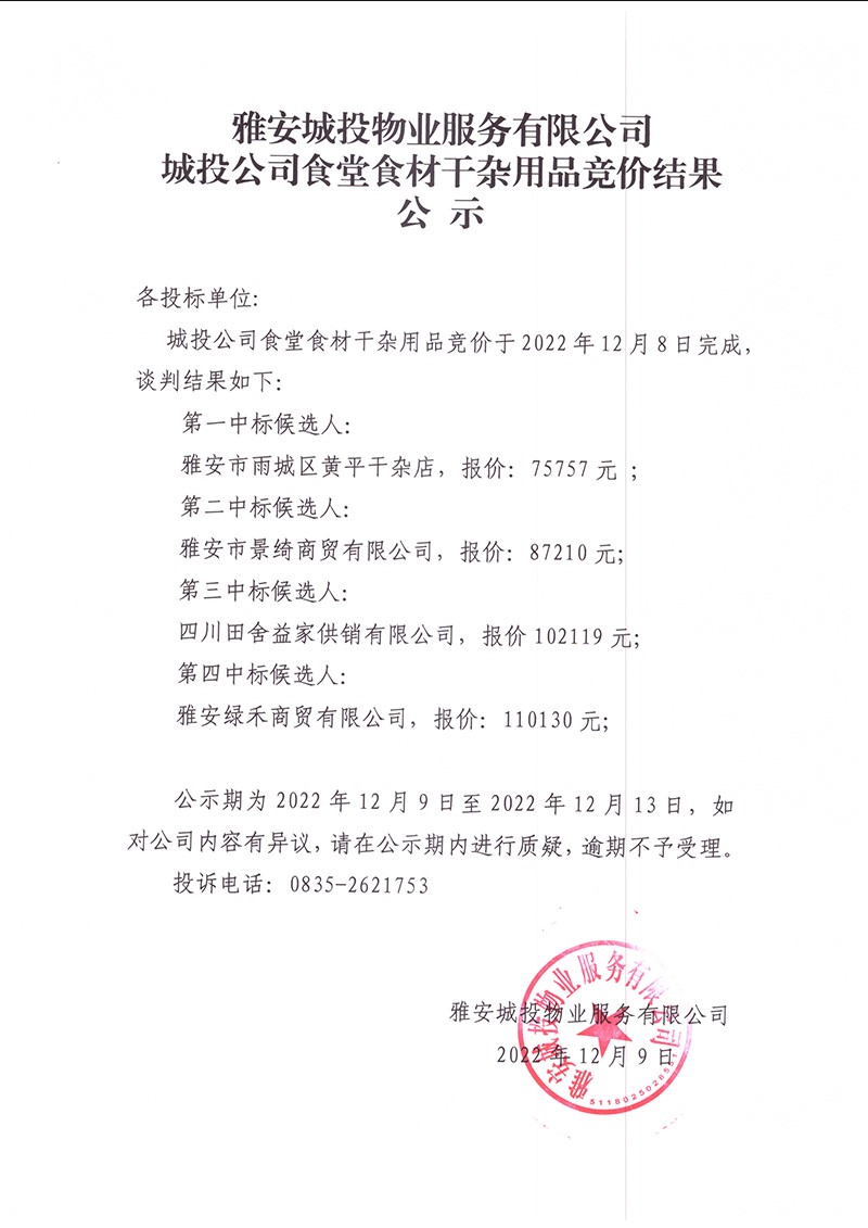 雅安城投物業(yè)服務有限公司城投公司食堂干雜競價結(jié)果公示