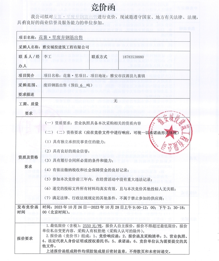 花襄·里廢棄鋼筋出售競價公告