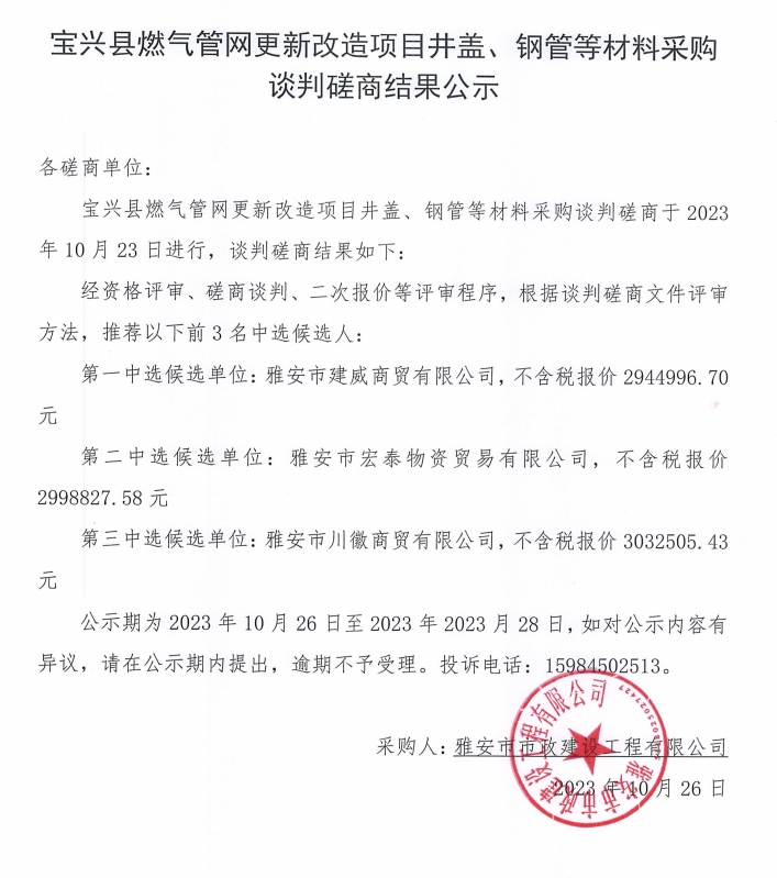寶興縣燃氣管網(wǎng)更新改造項目井蓋、鋼管等材料采購談判磋商結(jié)果公示