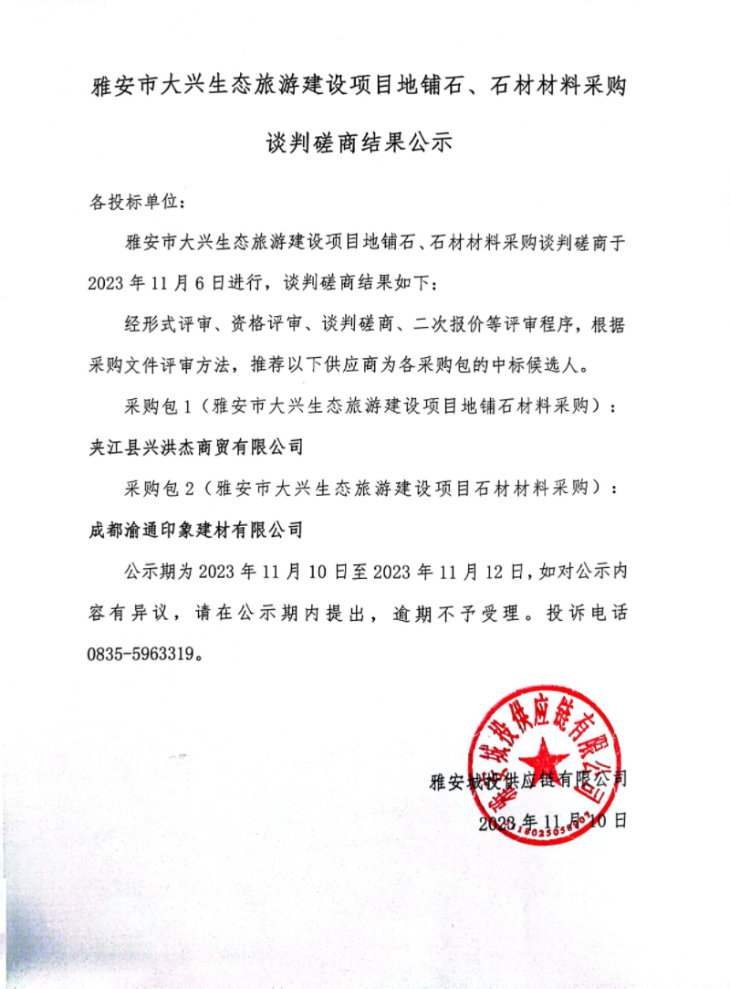 雅安市大興生態(tài)旅游建設(shè)項(xiàng)目地鋪石、石材材料采購談判磋商結(jié)果公示
