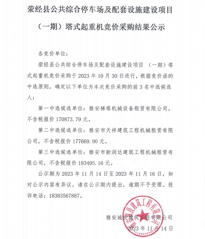 滎經(jīng)縣公共綜合停車場(chǎng)及配套設(shè)施建設(shè)項(xiàng)目(一期)塔式起重機(jī)競(jìng)價(jià)采購結(jié)果公示