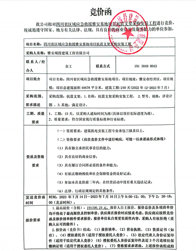 四川省區(qū)域應(yīng)急救援雅安基地項(xiàng)目抗震支架采購(gòu)安裝工程競(jìng)價(jià)公告