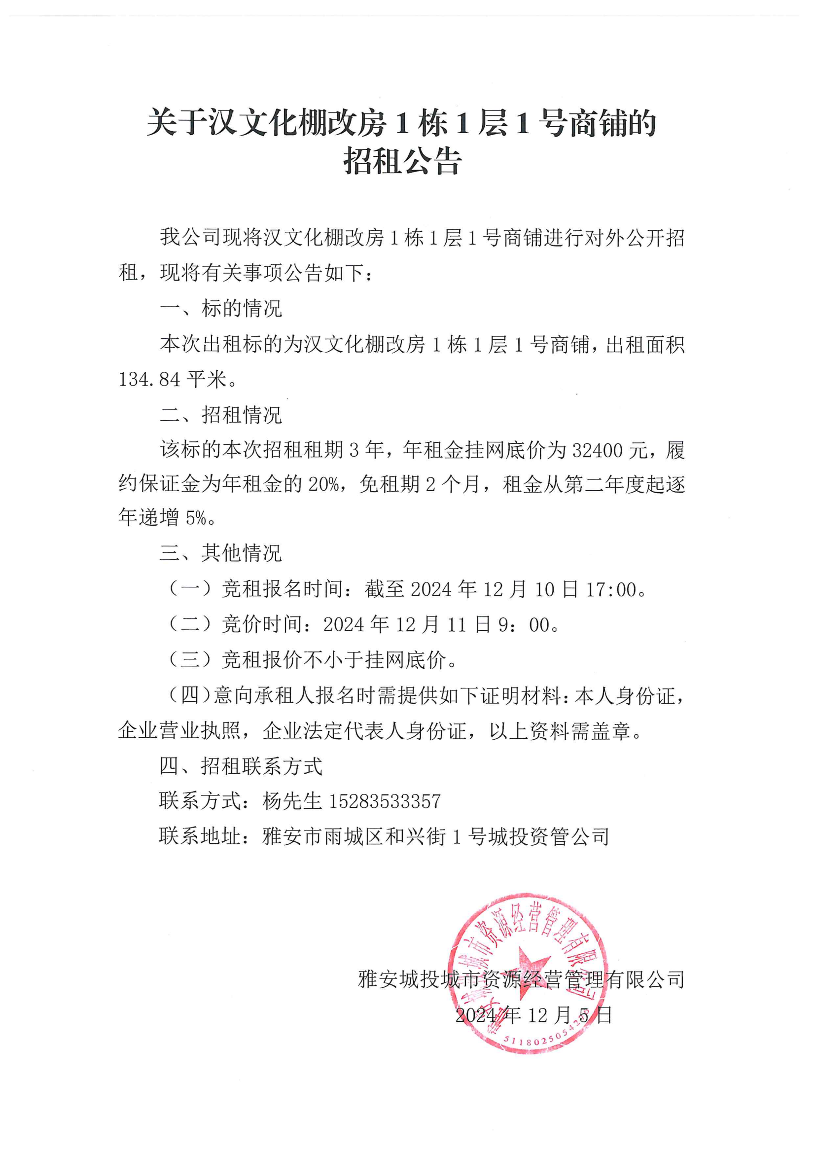 關(guān)于漢文化棚改房1棟1層1號商鋪招租公告