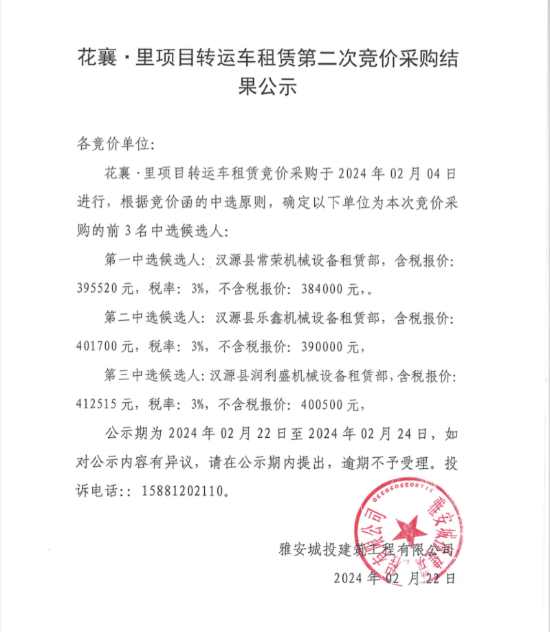 花襄·里項目轉運車租賃第二次競價采購結果公示