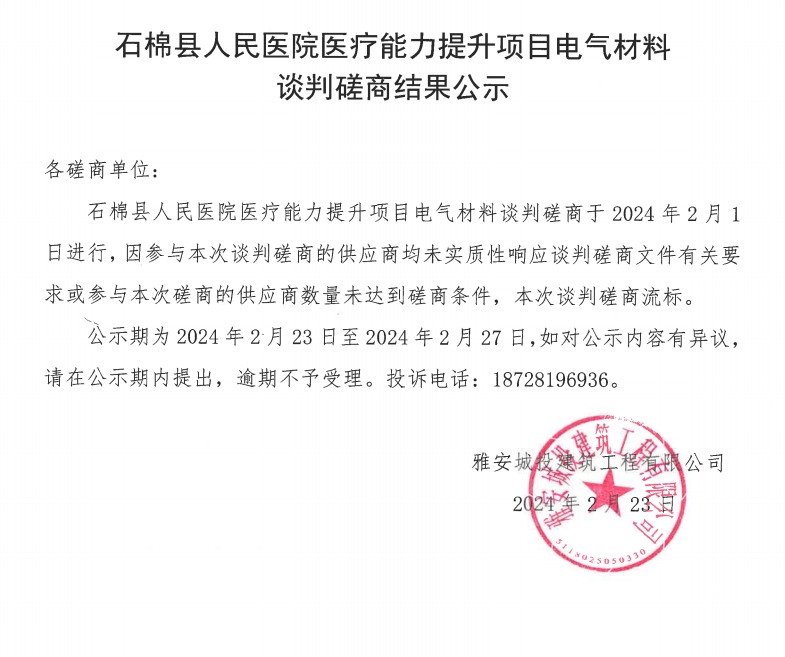 石棉縣人民醫(yī)院醫(yī)療能力提升項目電氣材料談判磋商結(jié)果公示