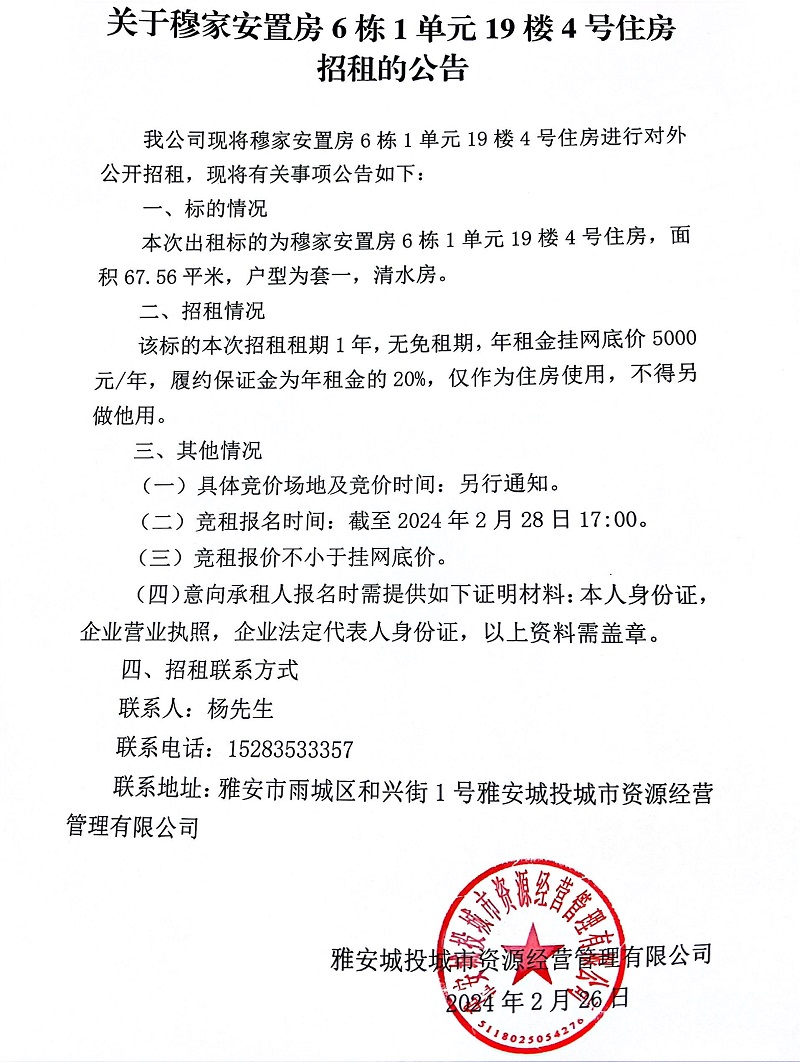 關(guān)于穆家安置房6棟1單元19樓4號(hào)住房招租的公告