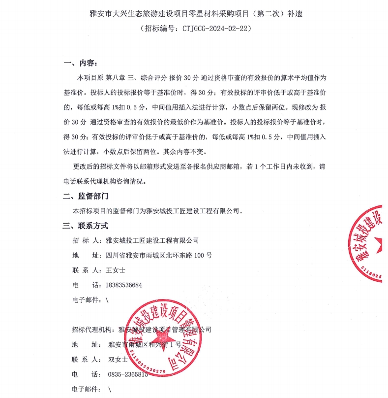 雅安市大興生態(tài)旅游建設(shè)項(xiàng)目零星材料采購項(xiàng)目(第二次)補(bǔ)遺公告