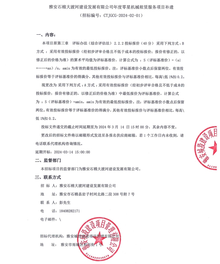 雅安石棉大渡河建設發(fā)展有限公司年度零星機械租賃服務項目補遺公告