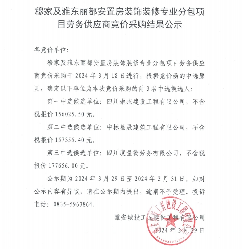 穆家及雅東麗都安置房裝飾裝修專業(yè)分包項(xiàng)目勞務(wù)供應(yīng)商采購競價(jià)采購結(jié)果公示