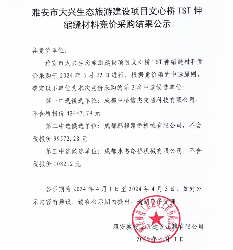 雅安市大興生態(tài)旅游建設(shè)項目文心橋TST伸縮縫材料競價采購結(jié)果公示
