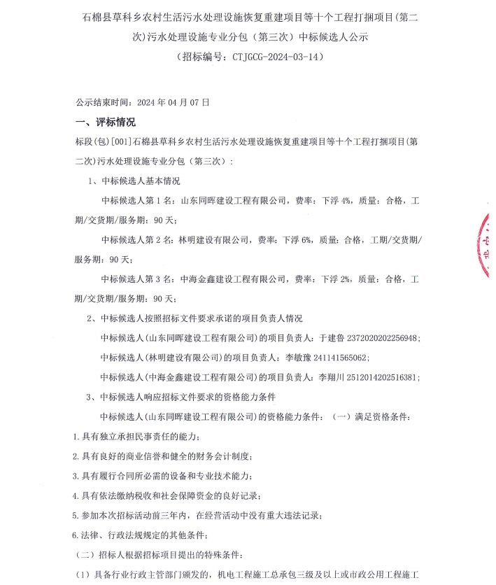 石棉縣草科鄉(xiāng)農(nóng)村生活污水處理設施恢復重建項目等十個工程打捆項目(第二次)污水處理設施專業(yè)分包(第三次)中標候選人公示