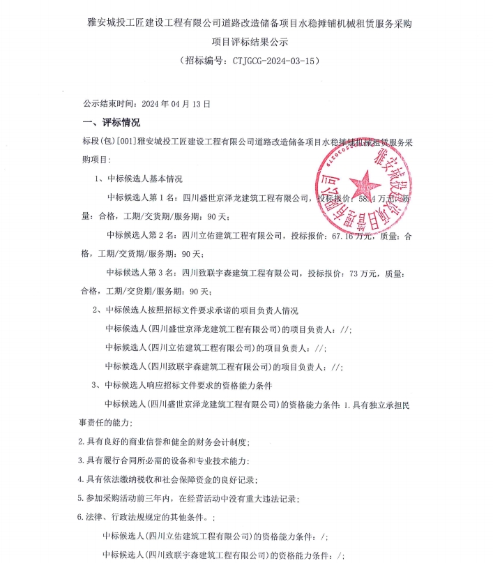 雅安城投工匠建設(shè)工程有限公司道路改造儲(chǔ)備項(xiàng)目水穩(wěn)攤鋪機(jī)械租賃服務(wù)采購(gòu)項(xiàng)目評(píng)標(biāo)結(jié)果公示