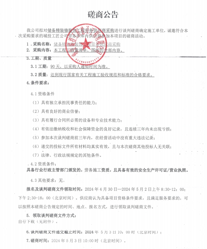 儲備精裝修裝飾工程勞務(wù)供應(yīng)商采購談判磋商公告