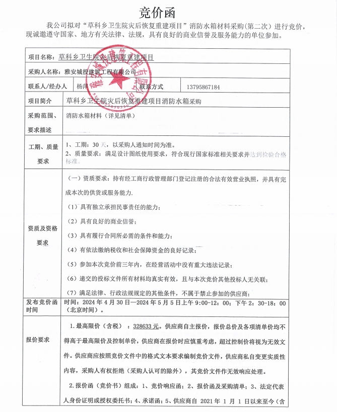 草科鄉(xiāng)衛(wèi)生院災(zāi)后恢復(fù)重建項目消防水箱采購(第二次)競價公告