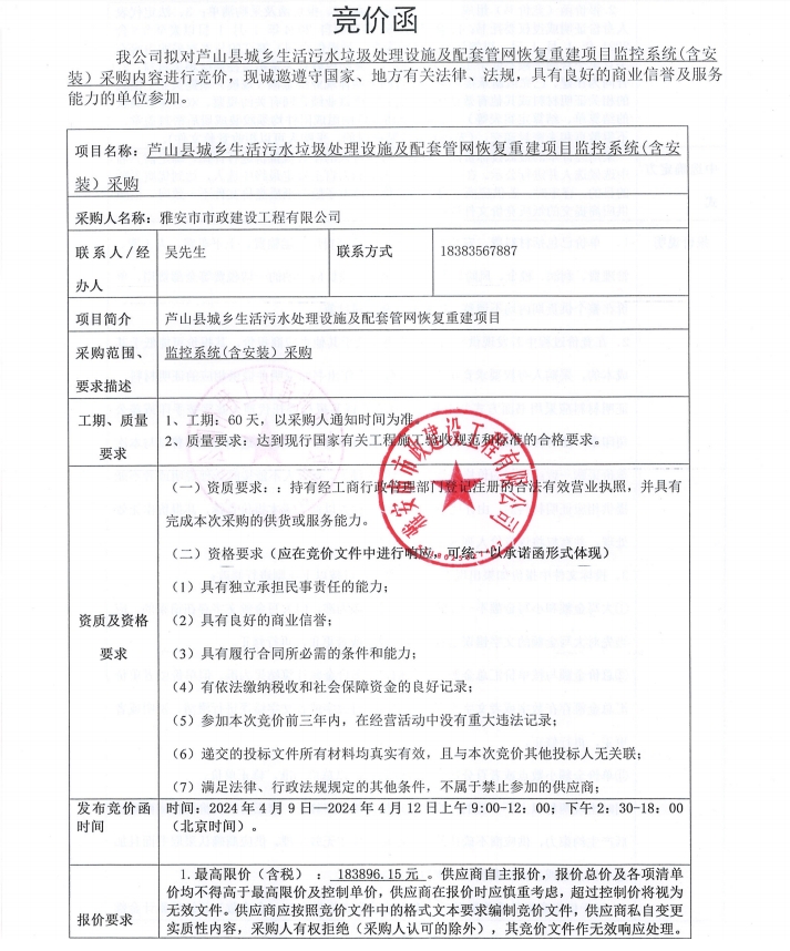 蘆山縣城鄉(xiāng)生活污水垃圾處理設(shè)施及配套管網(wǎng)恢復(fù)重建項目監(jiān)控系統(tǒng)(含安裝)采購內(nèi)容競價公告