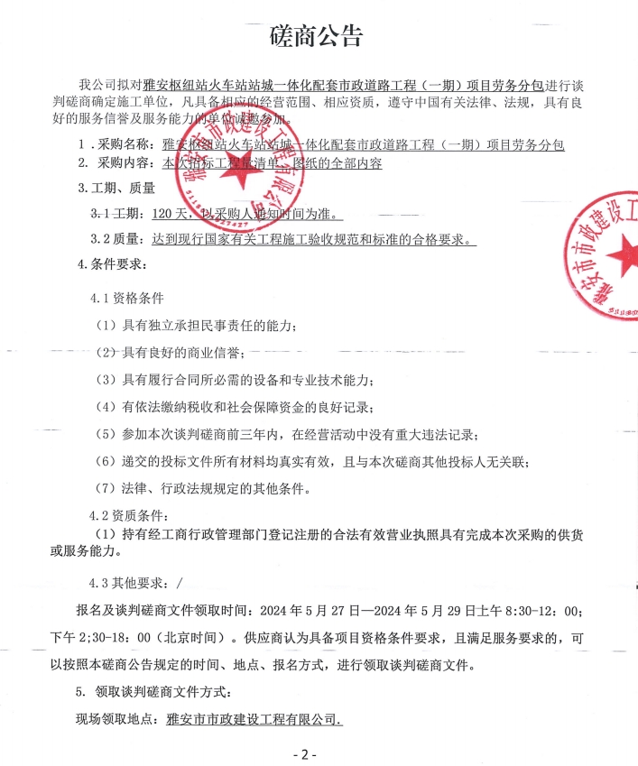 雅安樞紐站火車站站城一體化配套市政道路工程(一期)項目勞務(wù)分包磋商公告