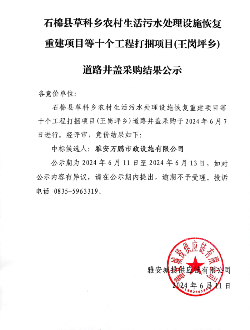 石棉縣草科鄉(xiāng)農(nóng)村生活污水處理設施恢復重建項目等十個工程打捆項目(王崗坪鄉(xiāng))道路井蓋采購結果公示