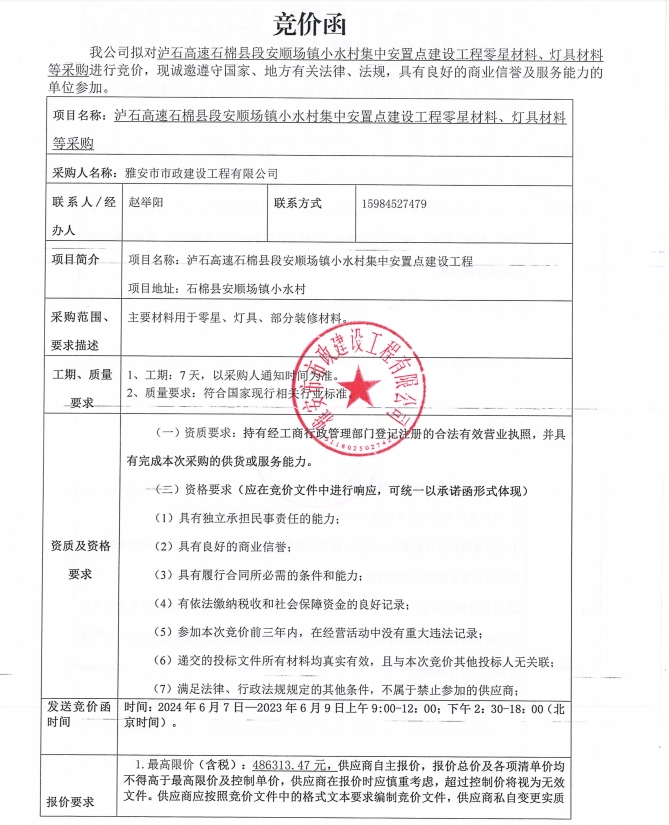 瀘石高速石棉縣段安順場(chǎng)鎮(zhèn)小水村集中安置點(diǎn)建設(shè)工程零星材料、燈具材料等采購競(jìng)價(jià)公告