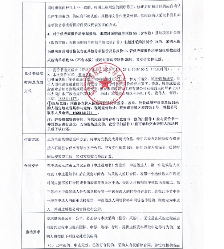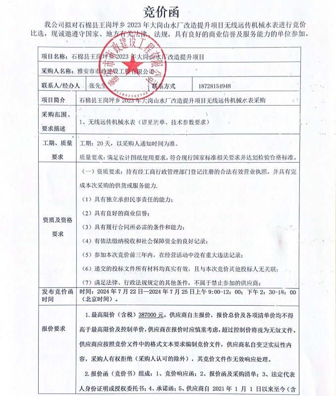 2023年大崗山水廠改造提升項(xiàng)目無線遠(yuǎn)傳機(jī)械水表競(jìng)價(jià)函