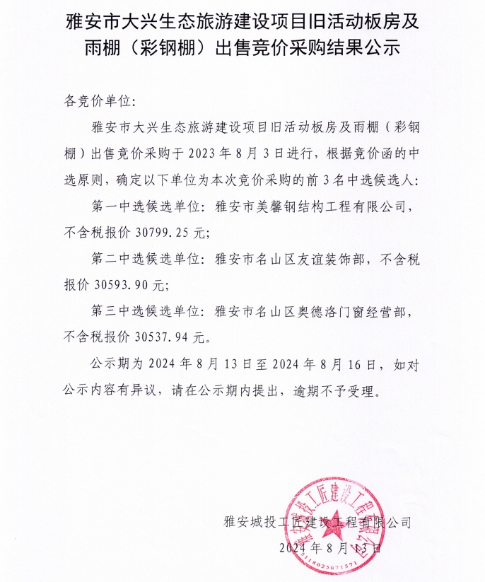 雅安市大興生態(tài)旅游建設(shè)項(xiàng)目舊活動(dòng)板房及雨棚(彩鋼棚)出售競(jìng)價(jià)采購(gòu)結(jié)果公示