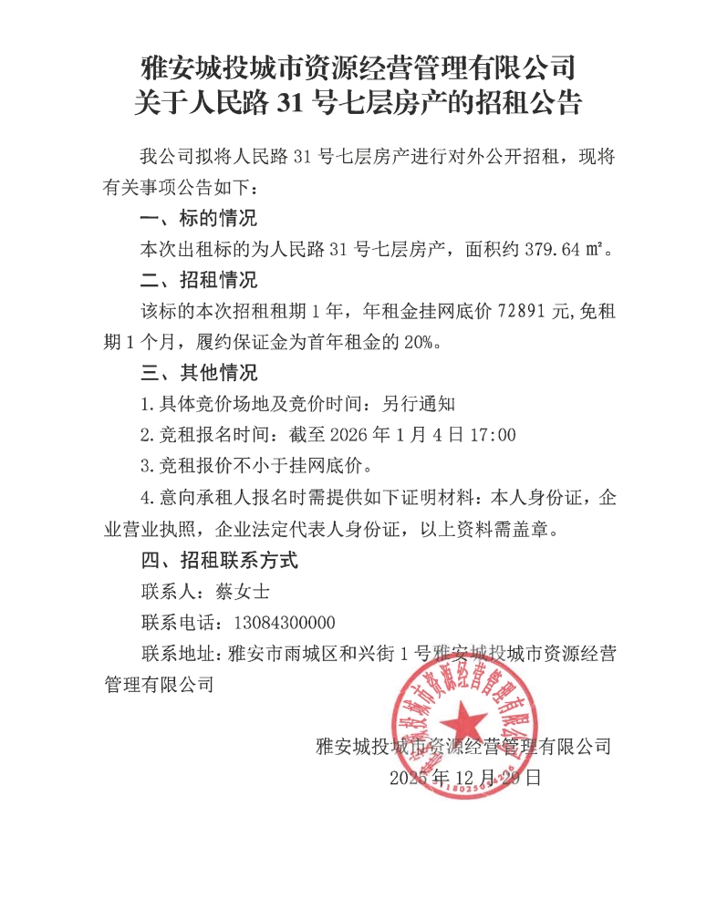 雅安城投城市資源經(jīng)營管理有限公司關(guān)于人民路31號七層房產(chǎn)的招租公告