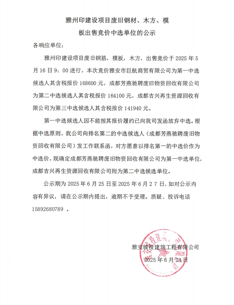 雅州印建設(shè)項(xiàng)目廢舊鋼材、木方、模板出售競價(jià)中選單位的公示
