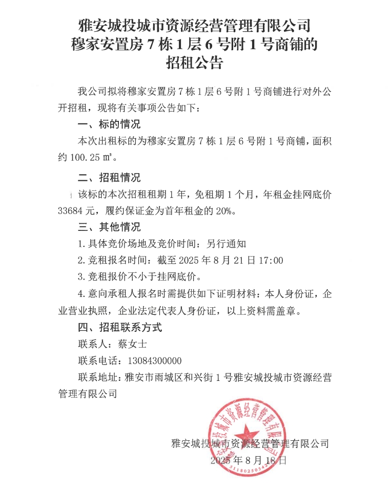 雅安城投城市資源經(jīng)營管理有限公司穆家安置房7棟1層6號附1號商鋪的招租公告