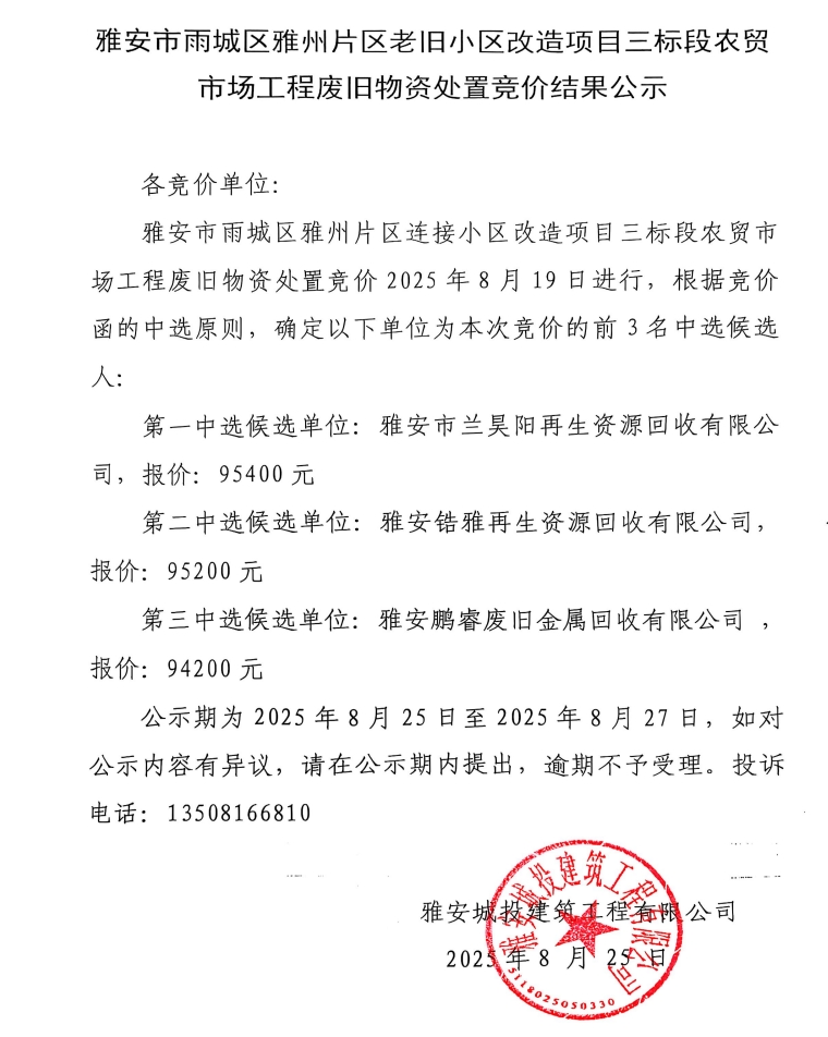 雅安市雨城區(qū)雅州片區(qū)老舊小區(qū)改造項(xiàng)目三標(biāo)段農(nóng)貿(mào)市場(chǎng)工程廢舊物資處置競(jìng)價(jià)結(jié)果公示