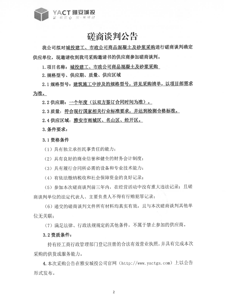 城投建工、市政公司商品混凝土及砂漿采購(gòu)磋商談判公告