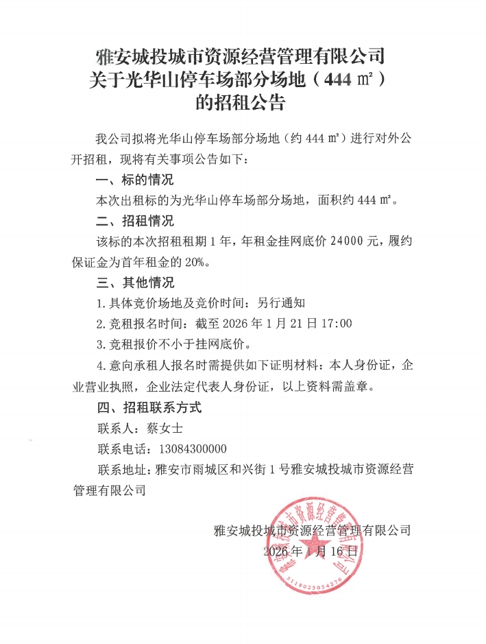 雅安城投城市資源經營管理有限公司關于光華山停車場部分場地(444㎡)的招租公告